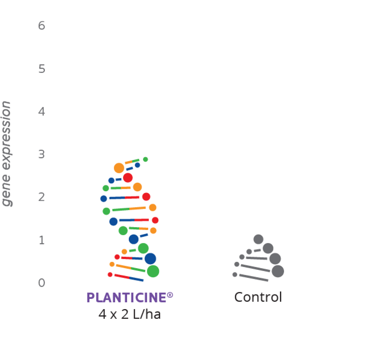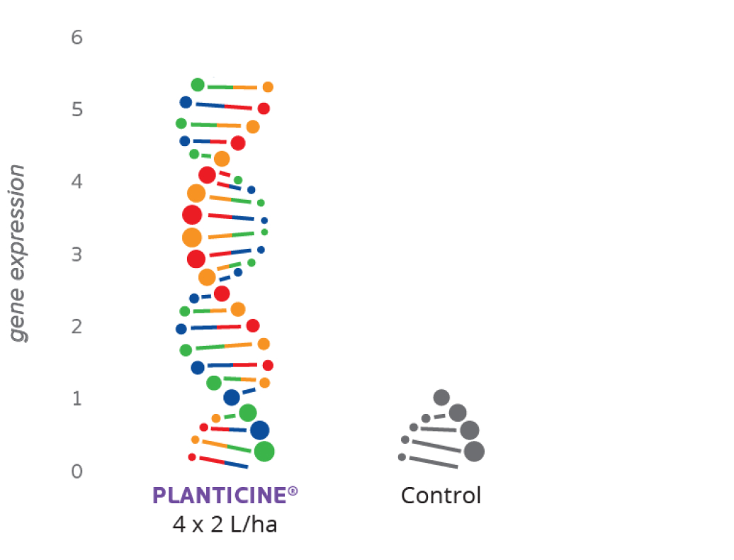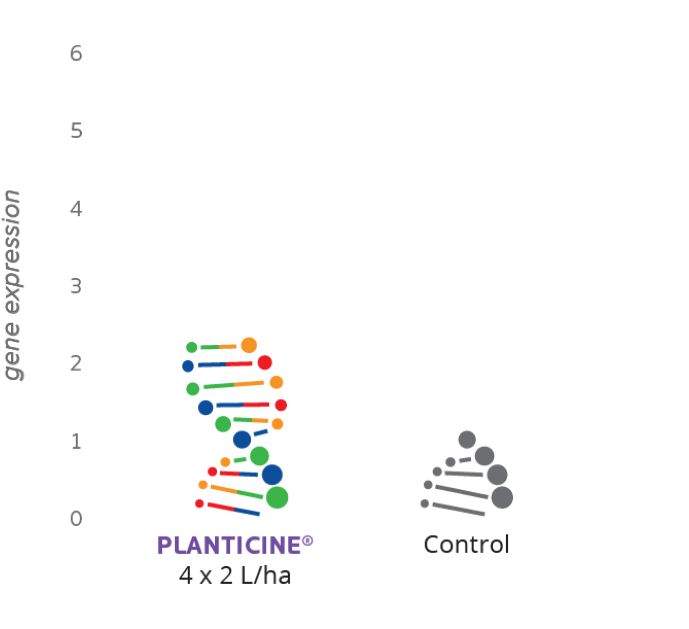 Foliar application of PLANTICINE® more than 2-times increases the activity of genes stimulating plant resistance to pathogens’ attack.